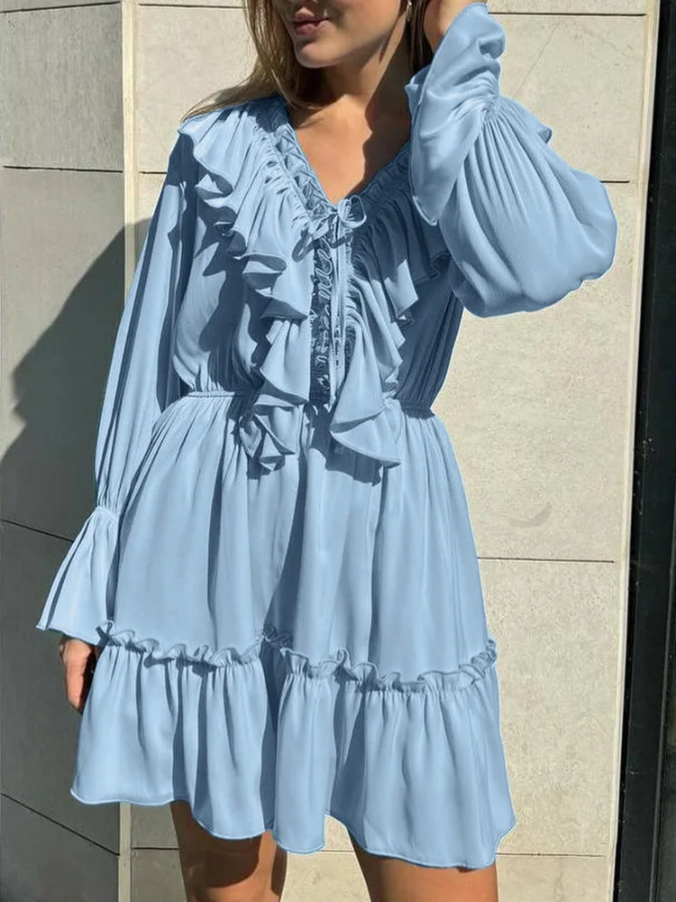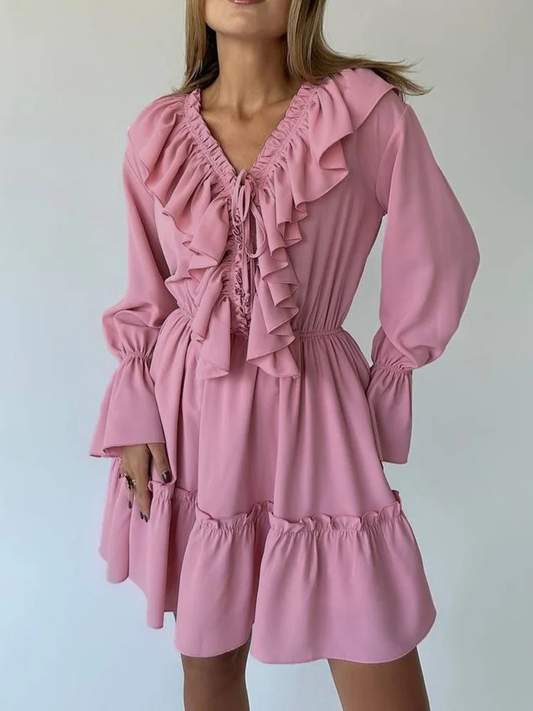 Treten Sie ein in den Frühling/Sommer mit unserem atemberaubenden einfarbigen Langarm-Partykleid! 🌸✨ Perfekt fürs Büro oder einen lässigen Ausflug, dieses Minikleid verfügt über einen schicken V-Ausschnitt und verspielte Rüschen, die Ihren Stil aufwerten. Mit einer bequemen Passform und leichtem Stretch ist es für den ganzen Tag konzipiert. In verschiedenen Größen erhältlich, ist dieses vielseitige Stück ein Muss für Ihre Garderobe! 🔥💃 #Fashion #SpringStyle #MiniKleid #OOTD
